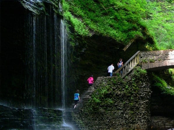 Your stay in the Watkins Glen State Park campground will be unforgettable. The amenities alone make it a camping dream – full-service campsites plus a playground, an Olympic-sized swimming pool, food and gift shop, and picnic pavilion all on manicured grounds. But it’s the Watkins Glen Gorge Trail that’s positively captivating. The 2.4 mile long path follows Glen Creek as it descends more than 400 feet through rugged, water-carved cliffs. Spellbinding, the winding trail takes you over, under and behind 19 waterfalls. Crystalline pools mesmerize, as do the surrounding rock walls that rise more than 200 feet above. It’s an otherworldly experience.